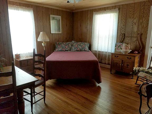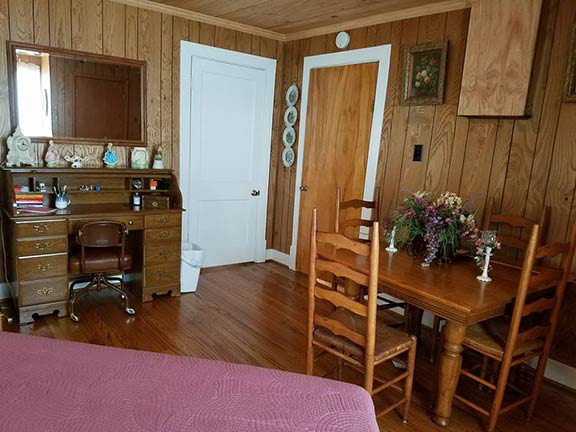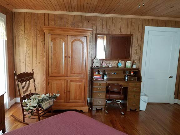 Large bedroom with a queen size bed, table and chairs, desk, rocker and TV hutch.