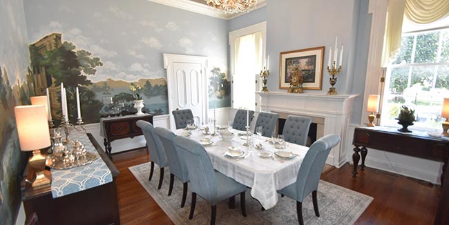 Formal Parlor - in addition to the grand fireplace, parlor seating and marble bistro tables for intimate talks or dining, guests will find a display of James K. Polk presidential china.