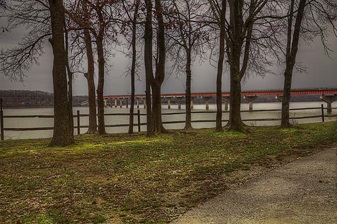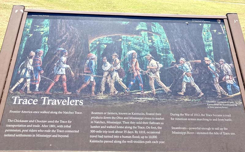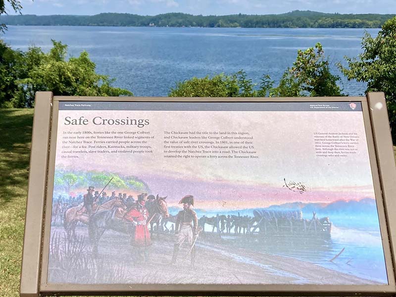Colbert's Stand - George Colbert operated a ferry across the Tennessee River from 1800 to 1819. His stand, or inn, offered travelers a warm meal and shelter during their journey on the Old Trace. Colbert looked after his own well being and once charged Andrew Jackson $75,000 to ferry his Tennessee Army across the river.The site of his stand is a short 50 yards up the path from the parking area. An additional 20 minute stroll will take you along the Old Trace to the bluff overlook and back. After a venison supper, one guest at Colbert's Stand spent the night in an outbuilding (Wilderness Haven) with "not less than 50 Indians, many of them drunk." Here and about 20 other stands along the Trace, Kaintuck riverboatmen, money-laden businessmen, Indians and outlaws shared a spot of fellowship on a long hazardous road.