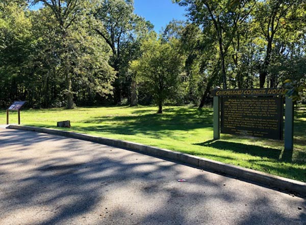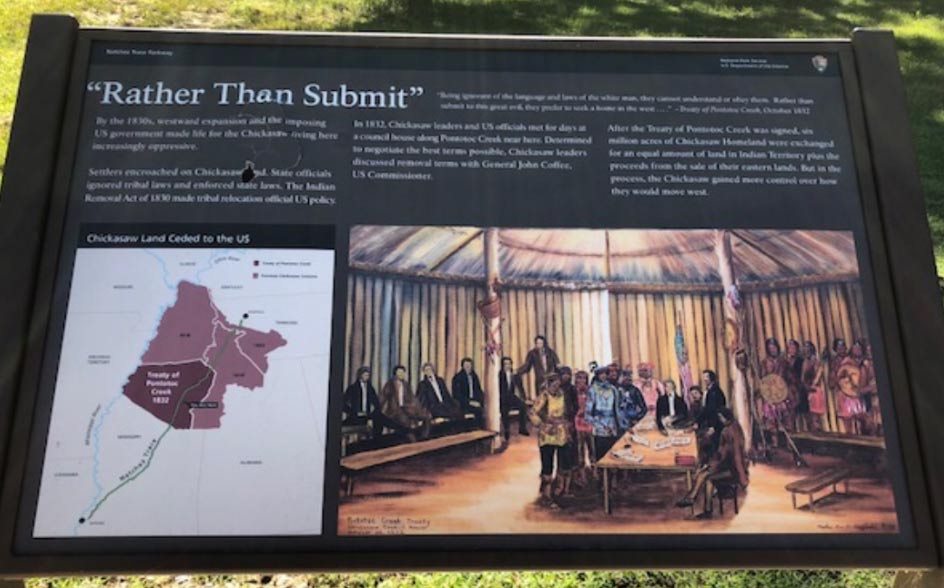 Westerly on the Natchez Trace stood an Indian village, Pontatock, with its council house, which in the 1820s became the capitol of the Chickasaw Nation. The chiefs and the head men met there to sign treaties or to establish tribal laws and policies. Each summer 2,000 or 3,000 Indians camped nearby to receive an annual payment for lands they had sold to our Federal government. After the treaty of 1832, the last land was surrendered. The council house disappeared but its memory remains here in the names of a Mississippi county and town that went west with the Chickasaw as a county and village in Oklahoma.