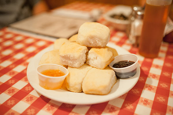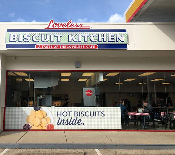 Biscuit Kitchen offers counter service with limited indoor seating and a drive-thru window located around the backside of the gas station. There is also a pedestrian bridge that connects to the Loveless Cafe property, so grab your food to-go and enjoy it on one of the many picnic tables located around the property.