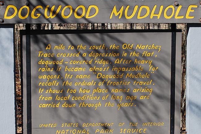 Dogwood Mudhole is located a mile to the south of the parkway. The Old Natchez Trace crossed a depression in the flat, dogwood covered ridge. After heavy rains it became almost impassable for wagons. Its name, Dogwood Mudhole, recalls the ordeals of frontier travel. It shows too, how place names arising from local conditions of long ago are carried down through the years.