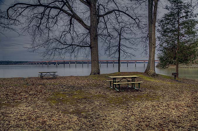 View of Tennessee River and John Coffee Memorial Bridge from the shoreline.